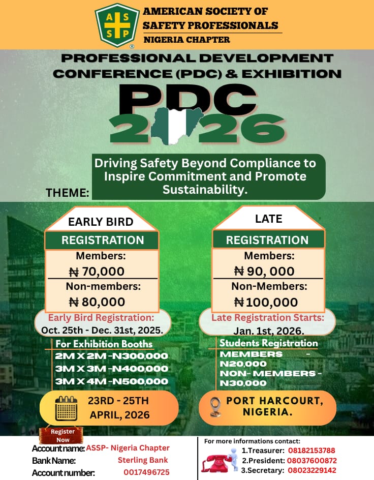 Join industry leaders, safety professionals, and innovators at the ASSP Nigeria Chapter Professional Development Conference (PDC) & Exhibition 2026 — the nation’s premier event dedicated to advancing occupational safety and health excellence.